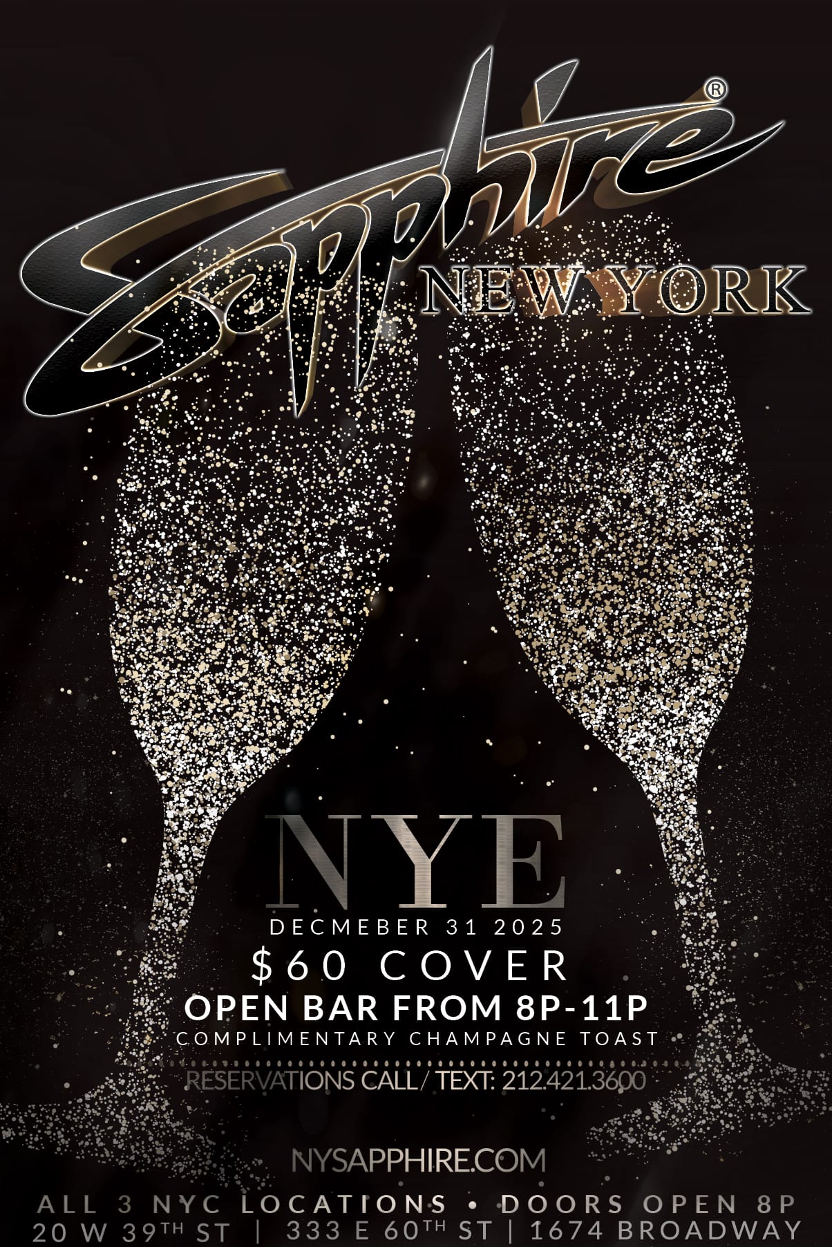 Sapphire NYC has three premium locations, with different events and specials every single night! It’s non-stop entertainment in the most luxurious settings for any mood or occasion. Looking for a bite to eat, a vibey place to watch the next game, or a special event elevated with one of our VIP packages? Check out our calendar and choose what vibes with you. See you at Sapphire.