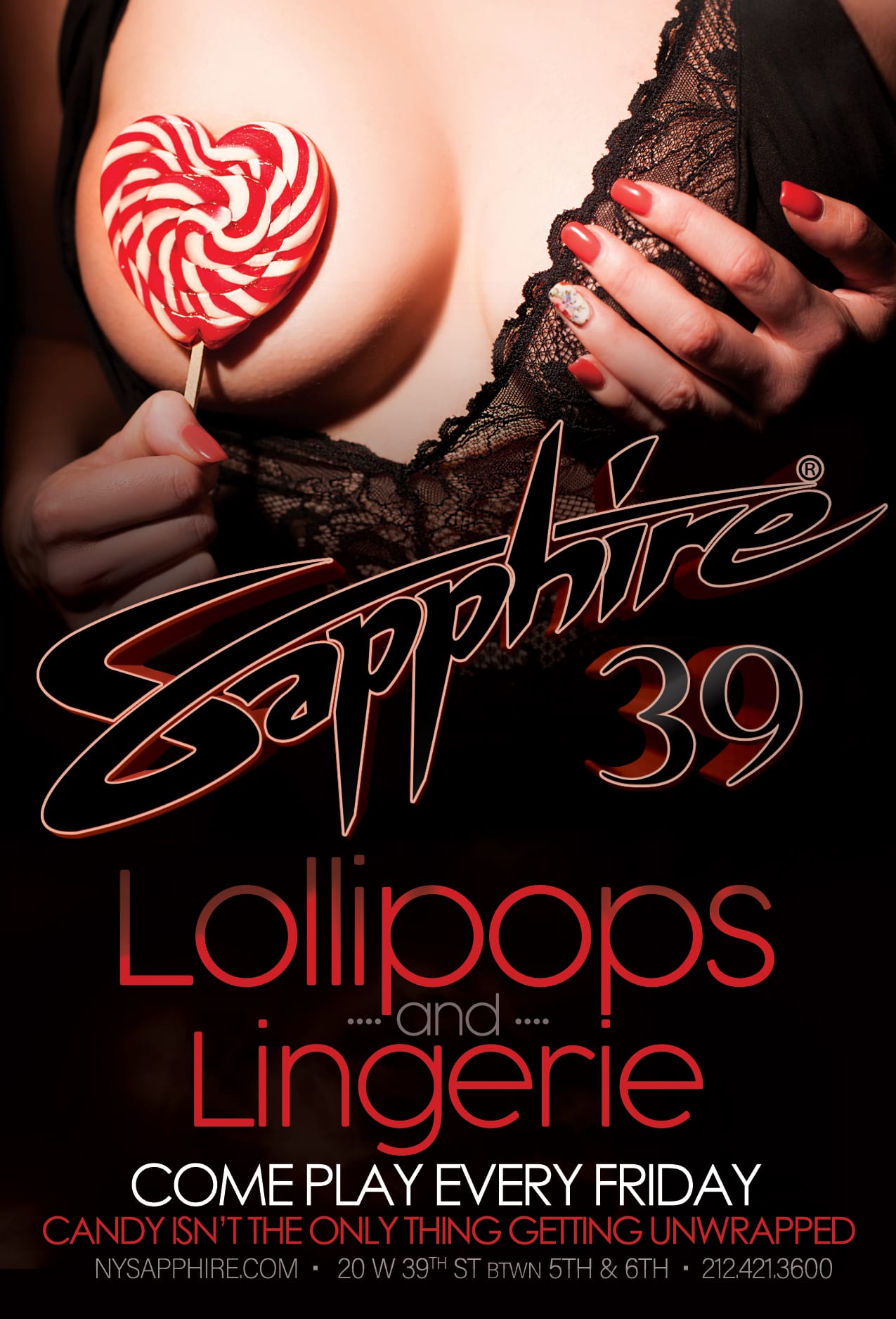 The ladies will be dressed to thrill in their sexiest lingerie, each with a lollipop twist that makes the night even sweeter. Think playful glances, teasing smiles, and just enough sugar to keep you wanting more. Sip, savor, and let the flirty fun take over as the party heats up every Friday at Sapphire 39!